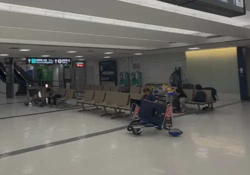 Most travelers rest on benches or seating areas inside the terminal. Quieter spots can be found away from busy walkways. There are also lounges and nearby hotels for a more comfortable stay.